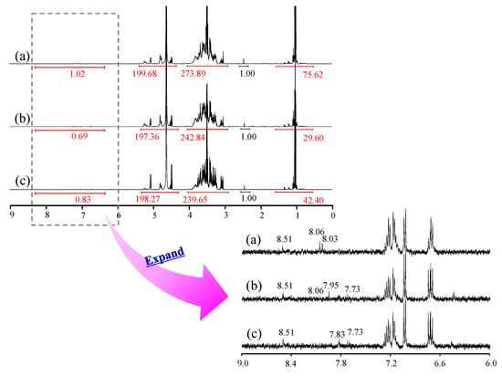 1H-NMR (D2O) spectra of Samples A, B, and C. (a) A, (b) B, (c) C.