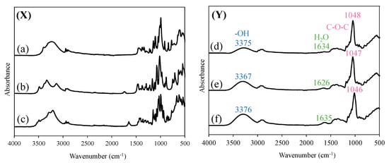 FT-IR spectra of (X) (a) glucose, (b) allose, (c) raffinose, and (Y) (d) A, (e) B, (f) C.