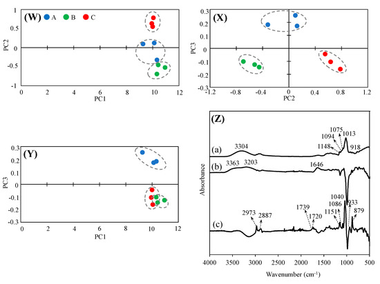 Principal component analysis of A, B, and C using FT-IR spectra score plot of (W) PC1 vs. PC2, (X) PC2 vs. PC3, (Y) PC1 vs. PC3, and FT-IR spectra of (Z) PC1, PC2, and PC3. (a) PC1 (b) PC2, (c) PC3.