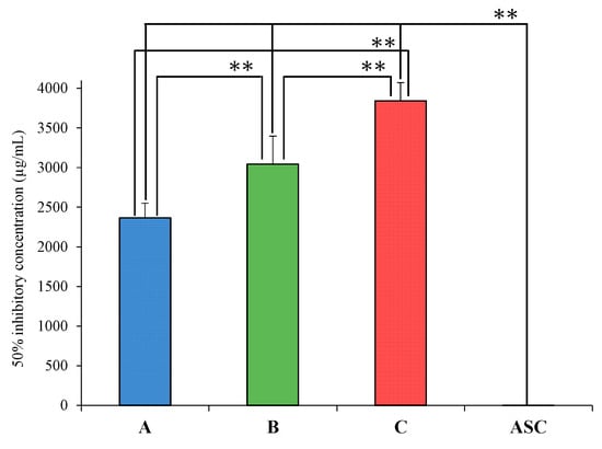 IC50 of Samples A, B, C and Ascorbic acid in a DPPH radical scavenging test. Values are the mean ± SD (n = 3), ** p < 0.01 (Tukey test).
