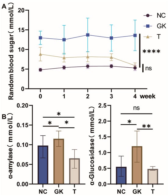 Effects of MFT on random blood glucose and intestinal α-glucosidase and α-amylase activities in hyperglycemic rats. (A): Random blood glucose values in mice. (B): α-glucosidase and α-amylase. Note: p < 0.05, * p < 0.05, ** p < 0.01 and **** p < 0.0001, ns no significant difference.