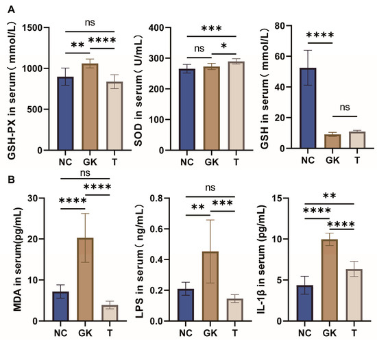 Effect of MFT on serum biochemical indicators in hyperglycemic rats. (A): Serum oxidative stress index. (B): Serum MDA, LPS, and IL-1β content. Note: p < 0.05, * p < 0.05, ** p < 0.01, *** p < 0.001, and **** p < 0.0001,. ns no significant difference.