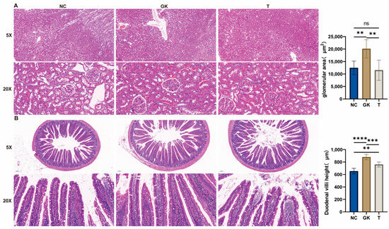 Effects of MFT on intestinal and renal structures in hyperglycemic rats. (A): Liver H&E section. (B): H&E section of duodenum. Note: p < 0.05, ** p < 0.01, *** p < 0.001, and **** p < 0.0001, ns no significant difference.