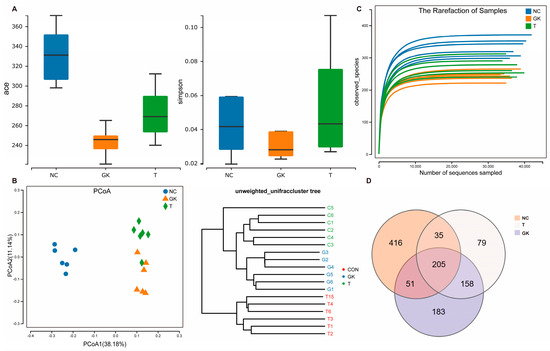 Diabetes is closely associated with intestinal microorganisms. We sequenced the V3–V4 hypervariable region of 16S rRNA from the gut flora of rats treated for 4 weeks and analyzed the effect of MFT extract on the gut flora of diabetic rats. As shown in Figure 5D, the number of OUTs in each group detected via 16S RNA sequencing is as follows: 621 in the NC group, 287 in the GK group, and 388 in the T group. The Simpson index of gut flora calculated from the OTU results was commonly used to assess the richness and diversity of the microorganisms in the rat gut. As shown in the figure, the ACE and Simpson indices of each test group were significantly different. Compared to the NC group, the Ace and Shannon index of the bacterial flora were considerably reduced in the GK group. This indicates that diabetes may lead to a reduction in the diversity of the gut flora in rats, resulting in gut dysbiosis. In addition, OTU-based Principal Coordinates Analysis (PCoA) and non-metric Multidimensional Scaling (NMDS) analysis were used to compare the overall effect of tea extract on the gut flora of diabetic rats. As shown in Figure 5D, the gut flora structures of the NC, GK, and T groups exhibited significant differences, suggesting notable variations in species composition among the groups. Among them, the GK group and the NC group showed substantial separation.