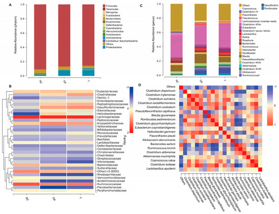 Different levels of gut flora abundance in diabetic rats. (A): Phylum level. (B): Genus level. (C): Family level. (D): Correlation of major bacterial groups at the genus level.
