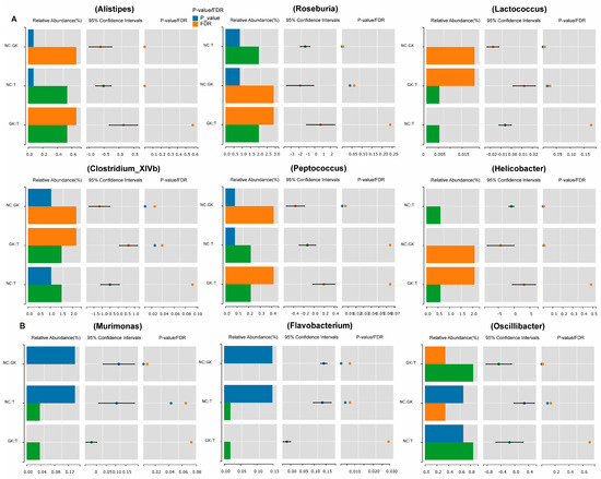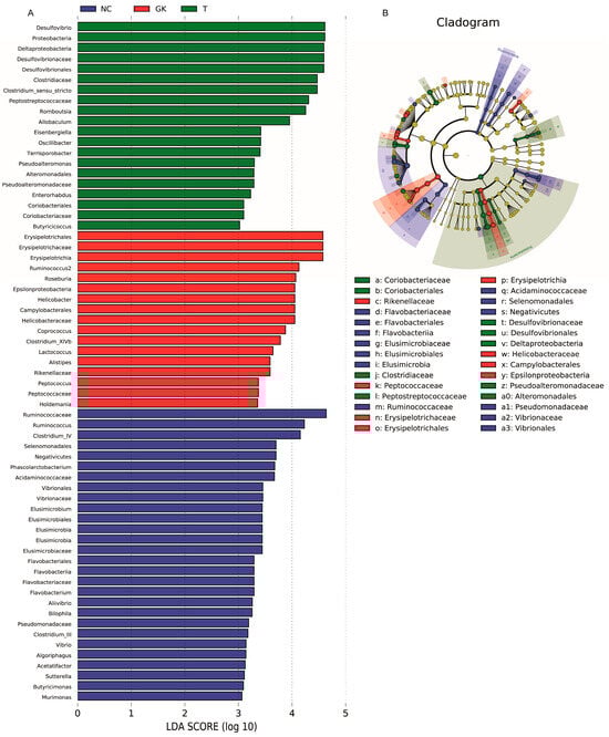The Linear Discriminant Analysis Effect Size (LEfSe) value indicates the degree of contribution of the microorganism to differentiating between groups. The larger the LDA value, the more significant the role of the microorganism in the differences between groups. We set an LDA threshold of 3 to identify species with significant differences in microbiota abundance. The results are shown in Figure 8. The NC group mainly enriched 28 dominant bacterial genera, including Flavobacteriales, Vibrionaceae, Bilophila, Vibrio, Sutterella, Algoriphagus, Pseudomonadaceae, Clostridium-IV, Acetatifactor, Ruminococcus, etc. Group T mainly enriched 20 dominant bacterial genera, including Desulfovibrio, Eisenbergiella, En-terorhabdus, Proteobacteria, Allobaculum, Oscillibacter, Pseudoalteromonas, Alteromonadales, Clostridiaceae, Romboutsia, etc. The GK group mainly enriches 17 dominant bacterial genera, including Roseburia, Ruminococcus, Erysipelotrichia, Coprococcus, Holdemania, Helicobacter, Campylobacterales, Helicobacteraceae, Peptococcus, Rikenellaceae, Alistipes, Lactococcus, etc. It hinted that Roseburia, Ruminococcus, Helicobacter, Helicobacteraceae, Peptococcus, Rikenel-laceae, Alistipes, and other bacteria constitute the core flora in GK diabetic rats.