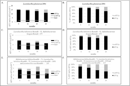 As shown in Figure 2A,B, 20.85% less bacteria in one capsule than at point “0” was noticed after two years of production, only containing Lactobacillus plantarum 299v. However, the result is still above the limit specification established in our laboratory, and the product is still qualified as safe and suitable for consumption. Decreasing the number of bacteria, assessed by the FCM, was 0.12 Log10 AFU/g (3.63 × 1010 AFU/g). Figure 2C,D shows the decrease in Lactobacillus helveticus Rosell-52 and Bifidobacterium longum Rosell-175 bacteria, and the difference is 0.16 Log10 AFU/g (2.81 × 1010 AFU/g). Multi-strain products, as shown in Figure 2E,F, characterize the greater difference in number of live and dead bacteria cells equal 0.26 log10 AFU/g (1.18 × 1010 AFU/g).