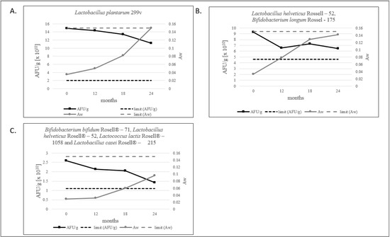 Water activity level for probiotic products should not exceed 0.2 [12]. For freeze-dried products, we defined that the aw limit should be below 0.15, and all tested products meet this criterion. The lowest level of water activity is shown by the multi-strain product, as shown in Figure 3C. Evidently, in our study, a decrease in the number of AFU/g and an increase in aw is observed (Figure 3A–C and Figure 4).