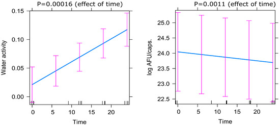 A mixed-effect linear model was used to analyze changes in AFU (log10 transformed) and water activity during a two-year period. The model was designed as a random intercept, with time serving as a fixed effect and the probiotic product serving as a random effect. The model was fitted in R (https://cran.r-project.org/) (accessed on 10 June 2023) using the lme4 (1.1–31) package. The model’s output was graphically summarized using the predictor effect plots built using the effects package (version 4.2.-2) for R. Predictor effect plots can help explain the relationships between the predictors and the response as an alternative to tables of regression coefficients. p value < 0.05 was considered statistically significant.