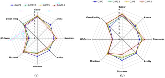 Mean values scores of the different sensory attributes evaluated in pasteurised orange juice with or without pulp and 0–7.5 % of RMD addition. (a) OJWP, orange juice without pulp; (b) OJP, orange juice with pulp. Concentric octagonal isolines show the axis tick marks.