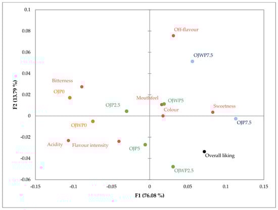 A correspondence analysis was carried out to relate the samples by means of the different juices with all the attributes evaluated and the assessors’ preferences. From this analysis, two factors were obtained that explained 90% of the variability in the results (Figure 2). The first factor (F1) explained 76.08% of the variability, and the second (F2) explained 13.79%. Figure 2 shows the projection in the plane of the juices and attributes derived from the correspondence analysis. Samples are mainly ordered from left to right in the graph, from the lowest to the highest RMD concentration on F1. OJP0 was identified as more bitter, whilst OJWO was related to acidity and flavour intensity. The OJWP5 sample was favourably evaluated for its colour and mouthfeel, and juices with higher concentrations of RMD were identified as the sweetest. Furthermore, sweetness is the sensory attribute that has the most weight on overall liking.