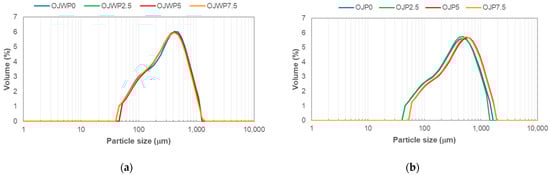 Volume particle size distributions (representative curves) of pasteurised orange juice with or without pulp and 0–7.5 % of resistant maltodextrin. (a) OJWP, orange juice without pulp; (b) OJP, orange juice with pulp.