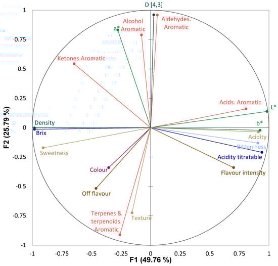 MFA was used to study the influences of all the different types of variables and to relate the results from instrumental and sensory determinations for the evaluated juices. The MFA constructs a sensory map in two dimensions. Factors 1 (F1) and 2 (F2) explained 75.55% of the data variability (Figure 4). The sensory acidity detected by panellists corresponds to the instrumentally measured acidity. In turn, the sensory sweetness reported by the panellists is also close to the measured °Brix. The parameter D[4,3] of the particle size determination and the perceived mouthfeel of the juices are related in F2 but in the opposite way. The sensorily evaluated off-flavours are close to the instrumentally quantified terpenes and terpenoids, and the flavour intensity is related to the acids of the determined aroma compounds.