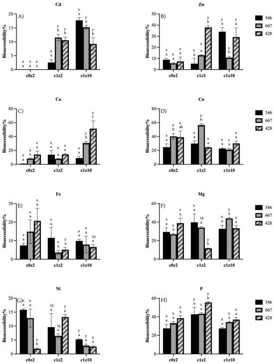 For the other minerals tested (Ca, Cu, Fe, Mg, Ni, and P), significant differences between lines and treatments were present. There was no difference in Ca BA between the lines in the c0z2 and c1z2 treatments. However, Ca BA (Figure 1C) increased from 8.3 to 30.7% in the medium (667) line between the c1z2 and c1z10 treatments and from 14.1 to 51.3% in the high (428) line between the two treatments. For Cu, there were slight differences between the lines within each treatment. There were significant differences in BA in the medium 667 line between treatments. Copper BA (Figure 1D) was increased from 40 to 56% in the c1z2 treatment, but was reduced to 21% by the c1z10 treatment. It was interesting to note that Fe and Mg bioaccessibility decreased in the high (428) line (Figure 1E,F) from 20% to 5% and from 38 to 11%, respectively, in the c1z2 treatment, while the BA levels recovered for Mg in the c1z10 treatment. Nickel BA (Figure 1G) increased from 1.8 to 13.3% in the high line, but was lower in all lines in the c1z10 treatment. Phosphorous BA (Figure 1H) was increased by Cd treatments in both the low and high lines but was back to control levels in the Zn fertilization treatment (c1z10).