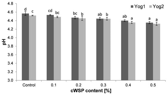 Comparison of the pH level of yogurts enriched with different concentrations of crude polysaccharides obtained from P. ostreatus mushroom and the control (plain yoghurt); Yog1 and Yog2 refer to different starter cultures. Bars indicate mean ± standard deviation (n = 3). Different letters indicate significant differences among the values according to Tukey’s test (p < 0.05).