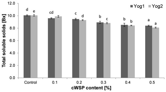 Total soluble solids (TSS) of yogurts enriched with different concentrations of crude polysaccharides obtained from P. ostreatus mushroom and the control (plain yoghurt); Yog1 and Yog2 refer to different starter cultures. Bars indicate mean ± standard deviation (n = 3). Different letters indicate significant differences among the values according to Tukey’s test (p < 0.05).