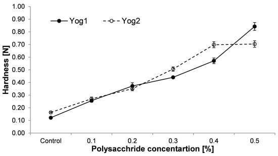 Hardness of yogurts enriched with different concentrations of crude polysaccharides obtained from P. ostreatus mushroom and the control (plain yoghurt); Yog1 and Yog2 refer to different starter cultures. Error bars indicates standard deviation (n = 3).