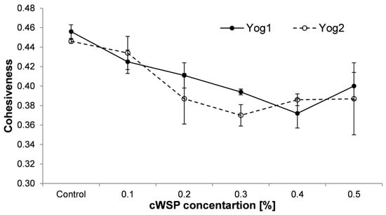 Cohesiveness is a parameter which measures the ratio of the positive force area from the second compression to the positive force area from the first compression []. This parameter corresponds to force, which integrates all constituents of the product as a whole. The values of cohesiveness are presented in Figure 4. They dropped along with the concentration of cWSP, reaching minimum values at 0.4% (Yog1—0.372 ± 0.015) and 0.3% (Yog2—0.37 ± 0.011). Then, after reaching the minimum, a slight increase in this parameter was observed (0.4 ± 0.014 and 0.387 ± 0.037, respectively, for Yog1 and Yog2). A similar finding was also reported by Wang et al. [], who noticed lower cohesiveness of yogurt which was enriched with A. cornea polysaccharides. Likewise, the addition of G. lucidum polysaccharides resulted in decreased cohesiveness []. The decrease in the cohesiveness parameter may be the consequence of forming gels of lower integrity and can be associated with increased syneresis [,].