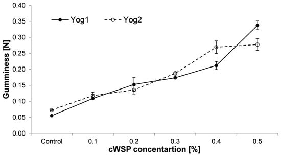 With regard to gumminess, this parameter is calculated as it is defined: hardness multiplied by cohesiveness []. As can be seen in Figure 5, it was observed that its value increased along with polysaccharide concentration in yogurts prepared with both types of starter culture. The highest gumminess values were recorded in the samples containing 0.5% of polysaccharides (0.337 ± 0.014 and 0.277 ± 0.018 for Yog1 and Yog2, respectively). On the contrary, control samples possessed the lowest values (0.055 ± 0.001 and 0.073 ± 0.002 for Yog1 and Yog2, respectively). This outcome is contrary to that of Kaur et al. [], who reported that the addition of barley β-glucans tends to decrease the gumminess of yogurts.