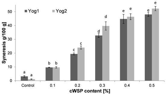 Syneresis of yogurts is a process in which whey is released from the formed gel. The presence of syneresis is negatively perceived by consumers and deteriorates the acceptance of the product []. As can be seen from Figure 6, syneresis level was the lowest in the control samples (3.19 ± 0.55 g and 1.15 ± 0.21 g for Yog1 and Yog2, respectively). The highest values were noticed in yogurts containing 0.5% of polysaccharides (48.02 ± 1.41 g for Yog1 and 52.22 ± 1.57 g for Yog2). In general, this study showed that syneresis increase was proportional to the content of polysaccharides, regardless of the starter culture used. A similar effect was noticed by Singh et al. [], who added the same concentrations of oat β-glucans. The present findings, however, do not support another previous study in which the addition of P. ostreatus and L. edodes polysaccharides did not worsen the consistency of yogurts (although in that work, the yogurts were evaluated only organoleptically) []. Moreover, Al-Sahlany et al. [] noticed that the presence of β-glucans extracted from yeast reduced syneresis. As can be seen from Figure 3 and Figure 6, the level of syneresis was proportional to the hardness values. This is in accordance with previous results, where researchers used as an additive carrageenan and glukomannan [] or whey preparations []. Singh et al. [] concluded that adding barley β-glucans to yogurts at a level higher than 0.3% leads to excessive syneresis (higher than ~20%) and significant deterioration of product quality. This study shows that P. ostreatus cWSP causes even higher syneresis compared to barley β-glucans; therefore, the use of these molecules seems to be limited in the production of set-type yogurts.