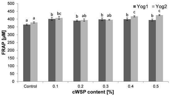 Ferric-reducing antioxidant power (FRAP) of yogurts enriched with different concentrations of crude polysaccharides obtained from P. ostreatus mushroom and the control (plain yoghurt); Yog1 and Yog2 refer to different starter cultures. Bars indicate mean ± standard deviation (n = 3). Different letters indicate significant differences among the values according to Tukey’s test (p < 0.05).