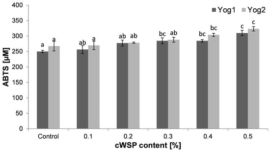 Similar to the FRAP method, in the assay with ABTS, the transfer of electrons takes place during the reaction (from antioxidants to ABTS radicals). However, these two methods may produce slightly different results, and thus, usually more than one antioxidant assay is performed []. The ability to neutralize ABTS radicals is shown in Figure 8. As with the FRAP method, the control samples showed the lowest antioxidant potential (Yog1, 250 ± 4 μM and Yog2, 267 ± 16 μM). However, the obtained values were lower than those obtained by de Carvalho et al. []. Along with the increase in the concentration of cWSP in yogurts, an increase in antioxidant properties was observed. The highest levels were found at a concentration of 0.5% (310 ± 9 μM and 323 ± 7 μM, respectively, for Yog1 and Yog2). The results obtained using the ABTS method were similar to those obtained with the FRAP method, and the correlation between these two antioxidant assays can be described as strong (r = 0.7). In both methods, differences were noticed between the two starter cultures. According to Fardet and Rock [], different bacterial strains show different proteolytic activity, which may lead to the release of a diverse quantity of antioxidant peptides.