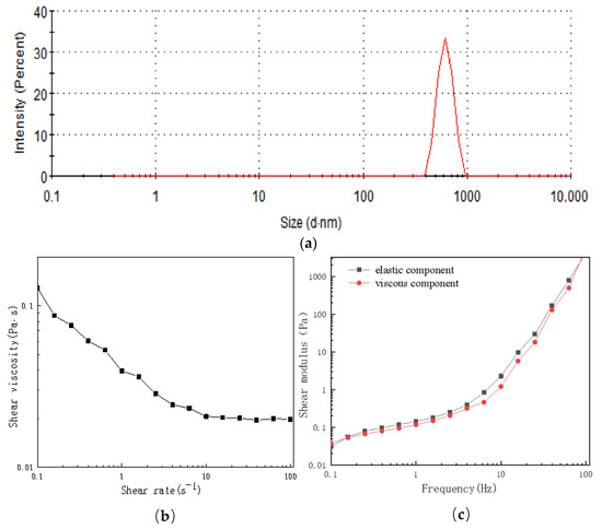 (a) Particle size analysis of wtofLPPs. (b) Effect of shear rate on viscosity of wtofLPPs. (c) Changes in storage modulus and energy.
