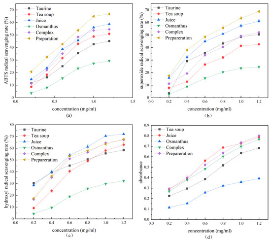 In Figure 2d, the absorbance was found to be stronger with greater antioxidant capacity, and it gradually increased with the concentration. At a concentration of 12 mg/mL, the absorbance of wtofLPP was 0.801, which was higher than that of the ternary compound (0.683), juice (0.787), tea soup (0.462) and osmanthus extract (0.372). This indicates that a synergistic antioxidant effect could be achieved among the components.