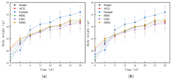The body weight of a rodent is indicative of its overall health status [27]. In this study, body weight measurements were taken every 4 days after a 7-day period of adaptive feeding and a subsequent 28-day intragastric administration of the liquid polyphenol preparation. The influence of wtofLPP on the body weight of mice is shown in Figure 3a. After the four-week intragastric administration, the body weight of mice in all groups, except for the normal group, increased gradually. Meanwhile, the body weight of swimming-trained mice was lower than that of the normal group. By the fourth week of the experiment, the body weight of the mice had stabilized, with the medium- and low-dose groups exhibiting the slowest rates of increase. The water intake of the mice in each group was normal, and there were no instances of mortality during the study.