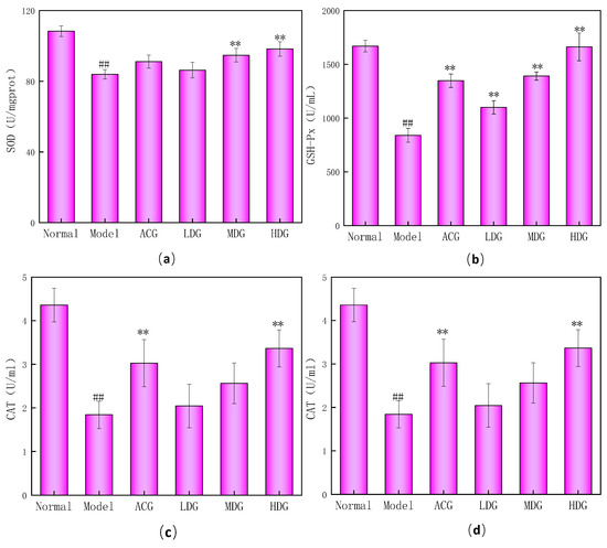 CAT is an important marker enzyme in the antioxidant enzyme system [30], which can convert H2O2 produced by SOD disproportionation into harmless water, and is an essential component of the biological defense system. As shown in Figure 4c, the CAT activity in the model group was significantly lower than that of the normal group (p < 0.01). The CAT activity in the high-dose group of the wtofLPP was significantly increased compared with that in the model group (p < 0.01), suggesting that the wtofLPP can effectively enhance CAT activity in mice.