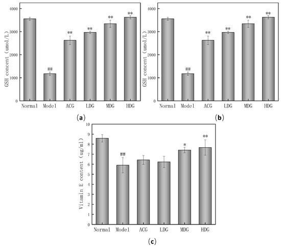 Vitamin E can inhibit lipid peroxide production and reduce oxidative damage in the body [35,36]. The effects of wtofLPP on the synthesis ability of Vitamin E in mice are shown in Figure 5c. The vitamin E level in the model group was significantly lower than that in normal group (p < 0.01), while the high-dose wtofLPP group exhibited a significantly higher vitamin E level compared to the model group (p < 0.01).