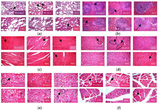 As illustrated in Figure 7c, the myocardial fibers (normal group) were closely arranged with clear nuclei, no shrinkage, and an absence of blood cells. In the model group, the cardiac fiber arrangement exhibited widened gaps, numerous blood cells, and scattered inflammatory cells in the nucleus, which was consistent with the literature reports [41]. The myocardial pathological changes were reduced in all dose groups, with the most substantial improvement observed in the high-dose group.