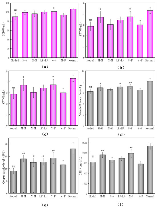 As shown in Figure 9e, ceruloplasmin levels in the model group were significantly lower than those in the normal group (p < 0.01). The ceruloplasmin levels in the N-F and M-M groups treated with the wtofLPP significantly increased (p < 0.01), and the levels of ceruloplasmin in the N-M and LP-LP groups also significantly increased (p < 0.05). Compared to those in the M-F group, the ceruloplasmin levels of the offspring in the M-M and N-F groups were less different from the normal group, indicating that fatigue-induced oxidative damage had a lesser effect on offspring in male mice than in the normal group.