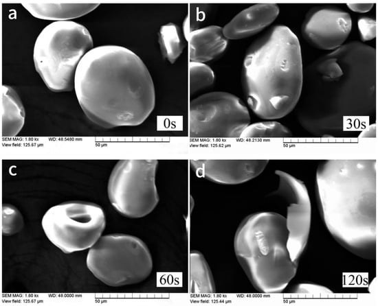 - Low-temperature and low-pressure plasma starch solid powder sample: weigh 0.100 g of starch in amp tubes and plug skimmed cotton in the seal to prevent the starch powder from sucking during the vacuum; connect the ampere with starch to the vacuum system; spark discharge to generate plasma at 0 s, 30 s, 60 s, 90 s, 120 s, 150 s, 180 s, and 300 s; and perform three parallel experiments at each time point. To reduce the thermal effect of plasma, the effect of excessive heat on the 10 s interval was measured. The starch samples with different plasma action times were obtained. Put the samples after action into the dryer for analysis and testing.