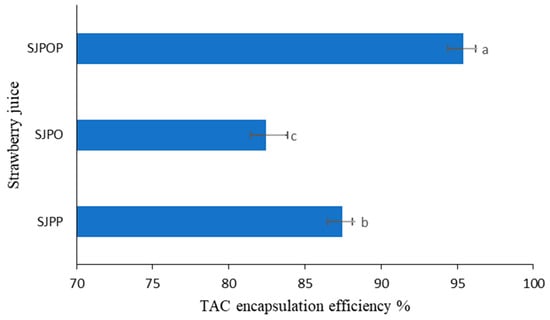 Anthocyanin encapsulation efficiency of encapsulated of strawberry (Fragaria × ananassa) juice. Error bars show the standard deviation value; bars with different letters are significantly different, p < 0.05. SJPP: Strawberry (Fragaria × ananassa) juice + pea protein isolate + psyllium mucilage; SJPO: Strawberry (Fragaria × ananassa) juice + pea protein isolate + okra mucilage; SJPPO: Strawberry (Fragaria × ananassa) juice + pea protein isolate + okra mucilage + psyllium mucilage.