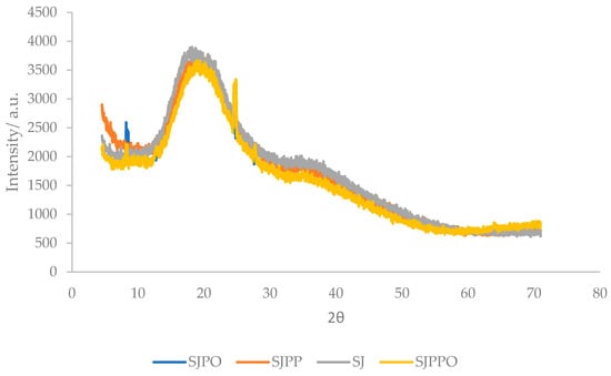 XRD analysis of strawberry microcapsules. SJ: strawberry juice, SJPO: strawberry (Fragaria × ananassa) juice + pea protein isolate + okra mucilage, SJPP: strawberry (Fragaria × ananassa) juice + pea protein isolate + psyllium mucilage, SJPPO: strawberry (Fragaria × ananassa) juice + pea protein isolate + okra mucilage + psyllium mucilage.
