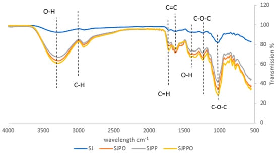Fourier transform infrared spectroscopy measurements (FT-IR) of strawberry microcapsules. SJ: strawberry juice, SJPO: strawberry (Fragaria × ananassa) juice + pea protein isolate + okra mucilage, SJPP: strawberry (Fragaria × ananassa) juice + pea protein isolate + psyllium mucilage, SJPPO: strawberry (Fragaria × ananassa) juice + pea protein isolate + okra mucilage + psyllium mucilage.