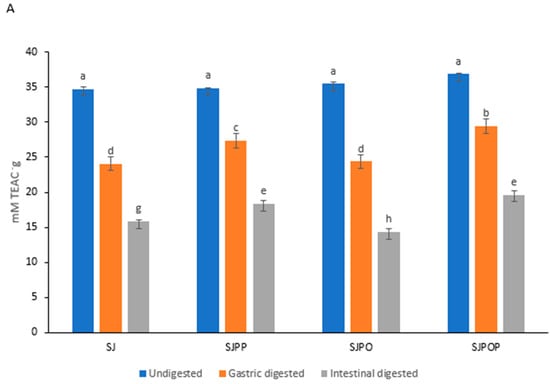 Effect of encapsulation of strawberry (Fragaria × ananassa) juice on FRAP (A), ABTS (B), and DPPH (C) scavenging activity. Error bars show the standard deviation value, bars with different letters are significantly different p < 0.05. SJ: strawberry (Fragaria × ananassa) juice, SJPP: strawberry (Fragaria × ananassa) juice + pea protein isolate + psyllium mucilage, SJPO: strawberry (Fragaria × ananassa) juice + pea protein isolate + okra mucilage, SJPPO: strawberry (Fragaria × ananassa) juice + pea protein isolate + okra mucilage + psyllium mucilage.