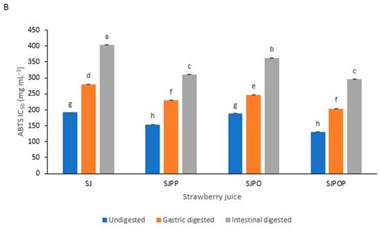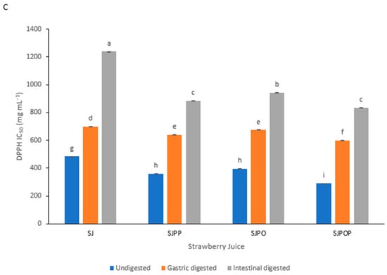 DPPH, FRAP, and ABTS were used to assess the antioxidant activity of undigested and digested (encapsulated or unencapsulated) strawberry juice extract. The results are shown as an IC50 value. Figure 6 illustrates how the antioxidant activity of the unencapsulated and encapsulated strawberry juice extracts changed throughout in vitro digestion. DPPH scavenging activity, ABTS capacity, and FRAP activity decreased as in vitro digestion progressed in all treatments. A lower IC50 value indicates more significant antioxidant activity. This study obtained the highest antioxidant activity (the lowest IC50 values) for SJPPO-encapsulated strawberry juice before digestion (undigested) and in the gastric phase. However, SJPPO- and SJPO-encapsulated strawberry juice showed the highest antioxidant scavenging activity in the intestinal phase; this can be attributed to the phenolic and anthocyanin composition in the intestinal phase. The ABTS scavenging activity also showed similar trends, showing that SJPPO- and SJPO-encapsulated strawberry juice showed the highest antioxidant scavenging activity in the intestinal phase. In contrast, SJPPO-encapsulated strawberry juice had the highest antioxidant power (FRAP) in the gastric phase relative to the other encapsulations. However, SJPPO- and SJPO-encapsulated strawberry juice exhibited the highest antioxidant power in the intestinal phase. The concentration of phenolic compounds in the intestinal phase was lower than in the undigested freeze-dried strawberry samples, resulting in a decrease in antioxidant activity. pH changes and digestive enzymes may significantly influence the susceptibility of this sensitive category of substances during digestion. As a result, there is a reduction in polyphenol stability and antioxidant activity. The susceptibility of polyphenols to neutral pH or polyphenol bioconversion to other structural types with distinct chemical characteristics may also be the cause of the decline in FRAP and DPPH levels []. However, the antioxidant activity of the strawberry juice extract was preserved during the encapsulating process. Comparatively to unencapsulated samples, encapsulated samples displayed the highest antioxidant activity values in the intestinal phase. A significant reason for this is the insulating properties of the wall material used in the encapsulation []. In addition, electrons from the barrier layer can participate in the antioxidant process, which increases the antioxidant effects of encapsulated fruit juices []. The redox characteristics of phenols allow them to operate as radical scavengers, hydrogen donors, and singlet oxygen quenchers, contributing to their antioxidant activity. Additionally, the amount and location of hydrogen-donating hydroxyl groups on the aromatic ring of phenol molecules affect free radical scavenging and antioxidant ability []. Also, releasing amino acids or sugars from the original dietary components may raise the overall antioxidant capacity assay readings.