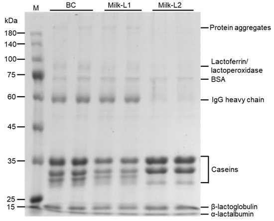 SDS-PAGE was performed in BC, Milk-L1, and Milk-L2 (Figure 1). High molecular weight protein aggregates (bands > 180 kDa) were observed in BC and Milk-L1, but were absent in Milk-L2. The streaking region (75–100 kDa) which corresponded to lactoferrin (~80 kDa)/lactoperoxidase (~78 kDa) was observed in BC and Milk-L1, with the band intensity in BC higher than that in Milk-L1. The bands 60–75 kDa, which may refer to BSA (bovine serum albumin, ~66 kDa), were observed in all the samples. The bands with a molecular weight slightly below 60 kDa could be the heavy chain of immunoglobulin G (~55 kDa), and the band intensity followed the pattern BC > Milk-L1 > Milk-L2. Additionally, caseins were separated in bands within the range between 25 and 35 kDa, and whey proteins, including β-lactoglobulin (18.4 kDa) and α-lactalbumin (14 kDa), were observed in all the samples. The band intensities of caseins followed the pattern Milk-L2 > BC > Milk-L1.