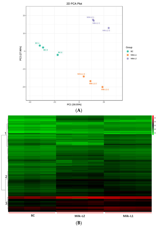 Multivariate statistical analyses were performed to assess the differences between the proteomic profiles of BC, Milk-L1, and Milk-L2. Principal component analysis (PCA) was firstly applied to investigate the internal structure of multiple variables according to different principal components. The result indicated that the three types of milk were divided into three distinct groups with principal component 1 (PC1) at 58.05% and principal component 2 (PC2) at 27.96% (Figure 2A). BC was clearly separated by PC1, while Milk-L1 was discriminated by PC2.