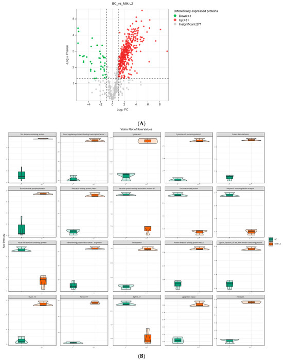 (A) Volcano plot of the differentially expressed proteins in bovine colostrum (control) and milk from the first lactation; BC: bovine colostrum, Milk-L1: mature milk from the first lactation. The red dots indicate the significantly up-regulated proteins, while the green dots show the significantly down-regulated proteins. The significance threshold is Log2FC (fold change) > 2 and p < 0.05, relative to control. (B) Representatives of the differentially expressed proteins regarding the comparison between bovine colostrum (control) and mature milk from the first lactation; BC: bovine colostrum, Milk-L1: mature milk from the first lactation. The box in the middle represents interquartile range. The 95% confidence interval is presented as a black line which penetrates through the box. The black line in the middle of the box is the median. The outer shape describes the density of distribution. (C) KEGG annotation of differentially expressed proteins in the comparison between bovine colostrum (control) and milk from the first lactation; the length of bars indicates the number of proteins annotated in each pathway. p value is marked at the end of each bar.
