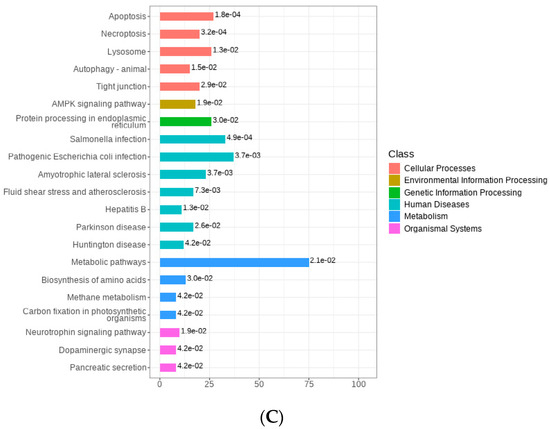 In the comparison of Milk-L2 and BC (control), 458 proteins were found to be up-regulated, while 13 proteins were down-regulated (Figure 4A). According to the fold change, the most up-regulated proteins were SEA domain-containing protein, sterol regulatory element binding transcription factor 1, syndecan-2, cysteine-rich secretory protein 2, and enteric β-defensin. However, vacuolar protein sorting-associated protein 4B, PIGR, kazal-like domain containing protein, and ephrin-A1 were among the most down-regulated proteins (Figure 4B). The differentially expressed proteins were also mostly involved in the pathways of human diseases, including salmonella infection and pathogenic E. coli infection (Figure 4C).