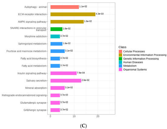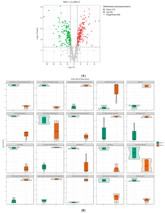 Regarding the comparison between Milk-L1 (control) and Milk-L2, 172 proteins were down-regulated, whereas 169 proteins were up-regulated (Figure 5A). Milk-L1 exhibited higher levels of vacuolar protein sorting-associated protein 4B, PIGR, fatty acid-binding protein 5, Ig-like domain-containing protein, and heterogeneous nuclear ribonucleoprotein A1, while Milk-L2 showed higher levels of sterol regulatory element binding transcription factor 1, transcription factor E2F6, syndecan-2, zinc finger protein CCCH-type, and PHD finger protein 3 (Figure 5B). The KEGG analysis revealed that the differentially expressed proteins were mainly involved in the ECM (extracellular matrix)-receptor interaction and the AMPK signaling pathways (Figure 5C).