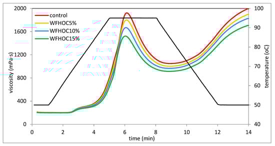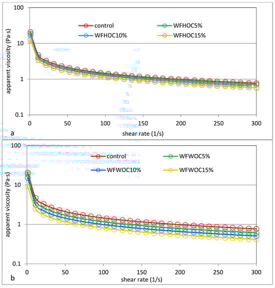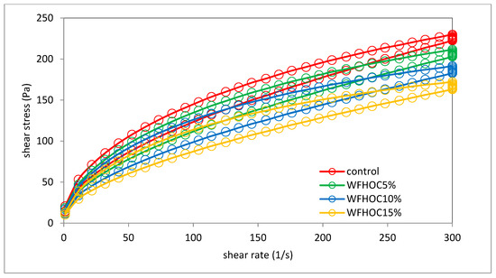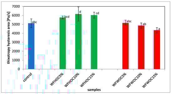 Figure 4 shows exemplary flow curves based on which the area of the hysteresis loop (HA) was determined. The area between the upper and lower flow curves is used to quantify the thixotropy phenomenon. All tested samples showed the phenomenon of thixotropy, which reflects the time necessary to transition from a given microstructural state to another [31]. Pastes containing WFHOC were characterized by higher values of the hysteresis loop areas compared with WF and WFWOC (Figure 5). This indicates that these systems needed more time to rebuild their structure after the applied stress was removed. A linear correlation was demonstrated between the K parameter and parameters illustrating the TO gelatinization process, TO retrogradation, TP, ΔHR, R, ash, fat, and protein content (r = −0.84, r = −0.86, r = −0.78, r = 0.94, r = 0.85, r = −0.75, r = −0.94, and r = −0.87, respectively; p < 0.05)