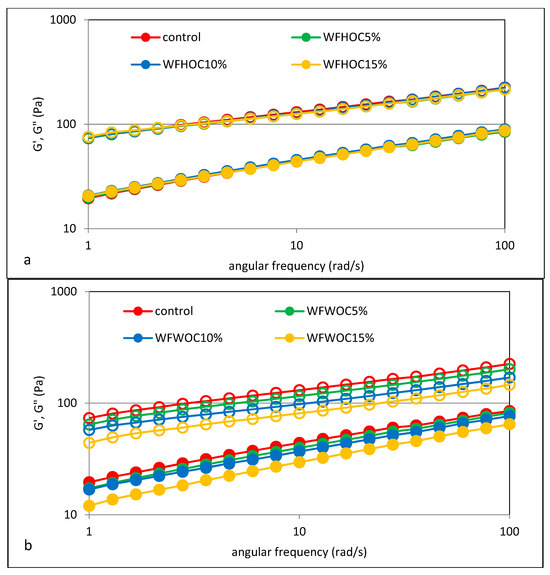 Mechanical spectra of wheat flour and system of wheat flour with hazelnut (a) and walnut oil cake (b). G′—empty markers; G″—filled markers.
