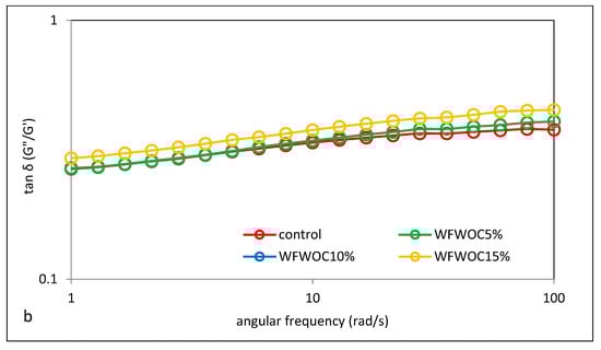 The mechanical properties of the tested samples were assessed using the sweep frequency test, as the dependence of the storage moduli G′ and loss modulus G″ on the angular velocity. The first one, G′, is a measure of the energy stored in the material during the cycle, and the loss modulus G″ reflects the energy lost and dissipated during the sinusoidal deformation cycle. In turn, the ratio of energy lost to stored in the cycle is determined by the parameter tangent of the phase shift angle (tan δ = G″/G′) [24]. Figure 6 shows the mechanical spectra of the control sample (WF) and the tested WFHOC and WFWOC systems, which are the dependence of the G′ modulus and the loss modulus G″ on the angular velocity. However, Figure 7 shows the values of the phase shift angle tan δ (tan δ = G″/G′). It was found that for all analyzed samples, the values of the storage modulus (G′) were higher than the values of the loss modulus (G″). This clearly proves the dominance of elastic features over viscous features. In all analyzed cases, a constant increase in the values of the storage modulus and loss modulus with angular velocity was also observed. The values of the phase shift angle tan δ calculated in the angular frequency range 1–100 rad·s−1 were also in all cases smaller than unity and greater than 0.1, which additionally confirms the dominance of elastic over viscous features and indicates that the tested systems have nature of weak gels. In the case of WFHOC, the values of the G′ and G″ modulus were very close to each other. However, in the case of WFWOC, the values of G′ and G″ differed depending on the level of WOC in the system. It should be stated that the lowest values were recorded in the samples in which WF was replaced by WOC, comparing the values of the storage modulus and the loss modulus in the entire range of angular velocity determined experimentally for all the analyzed systems. This is confirmed by the previously presented results related to gelatinization curves and apparent viscosity. These observations are consistent with the results presented by Pycia and Juszczak [13], where the impact of substituting wheat flour with ground walnuts or hazelnuts was analyzed.