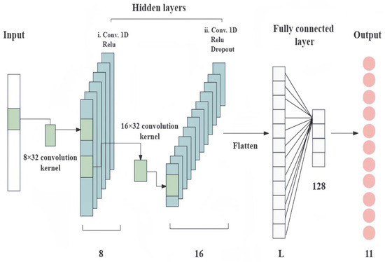 (3) There were two convolutional layers. The rectified linear unit (ReLU) function was regarded as the activation function of both convolutional layers. The convolutional layer 1 achieved convolution in 1D with 8 convolution kernels with a size of 32, with a stride of 1. Therefore, when data with 1030 features underwent convolution with a size of 32, the resulting number of features was (1030–32) + 1, which is 999 features. The third parameter, namely, 8, represented the number of convolutional kernels, each of which learned different features and generated an output sequence.