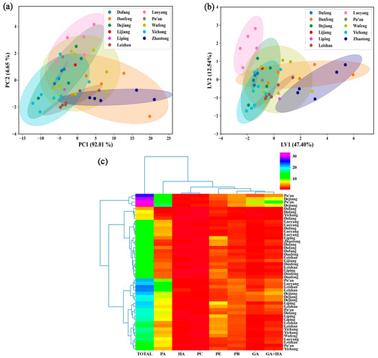 Multi-indicator analysis of the origin of G. elata: (a) PCA, (b) PLS-DA, and (c) clustered heatmap. GA: gastrodin; HA: p-hydroxybenzyl alcohol; PE: parishin E; PB: parishin B; PC: parishin C; PA: parishin A; GA + HA: the sum of gastrodin and p-hydroxybenzyl alcohol; total: the sum of gastrodin, p-hydroxybenzyl alcohol, parishin E, parishin B, parishin C, and parishin A.