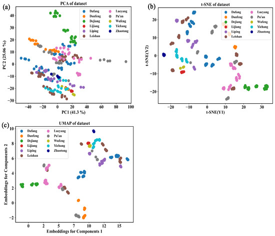 To understand the similarities and differences in the Vis-NIR spectral datasets of G. elata samples obtained from 11 different origins more intuitively and fully, three methods were used to map the Vis-NIR spectral datasets pre-processed with SD to a 2D space. As shown in Figure 5a–c, where each point represents an individual sample, visualization analysis was performed on the 11 datasets.